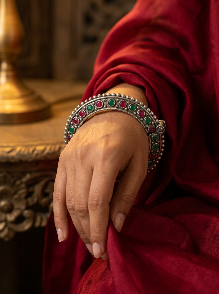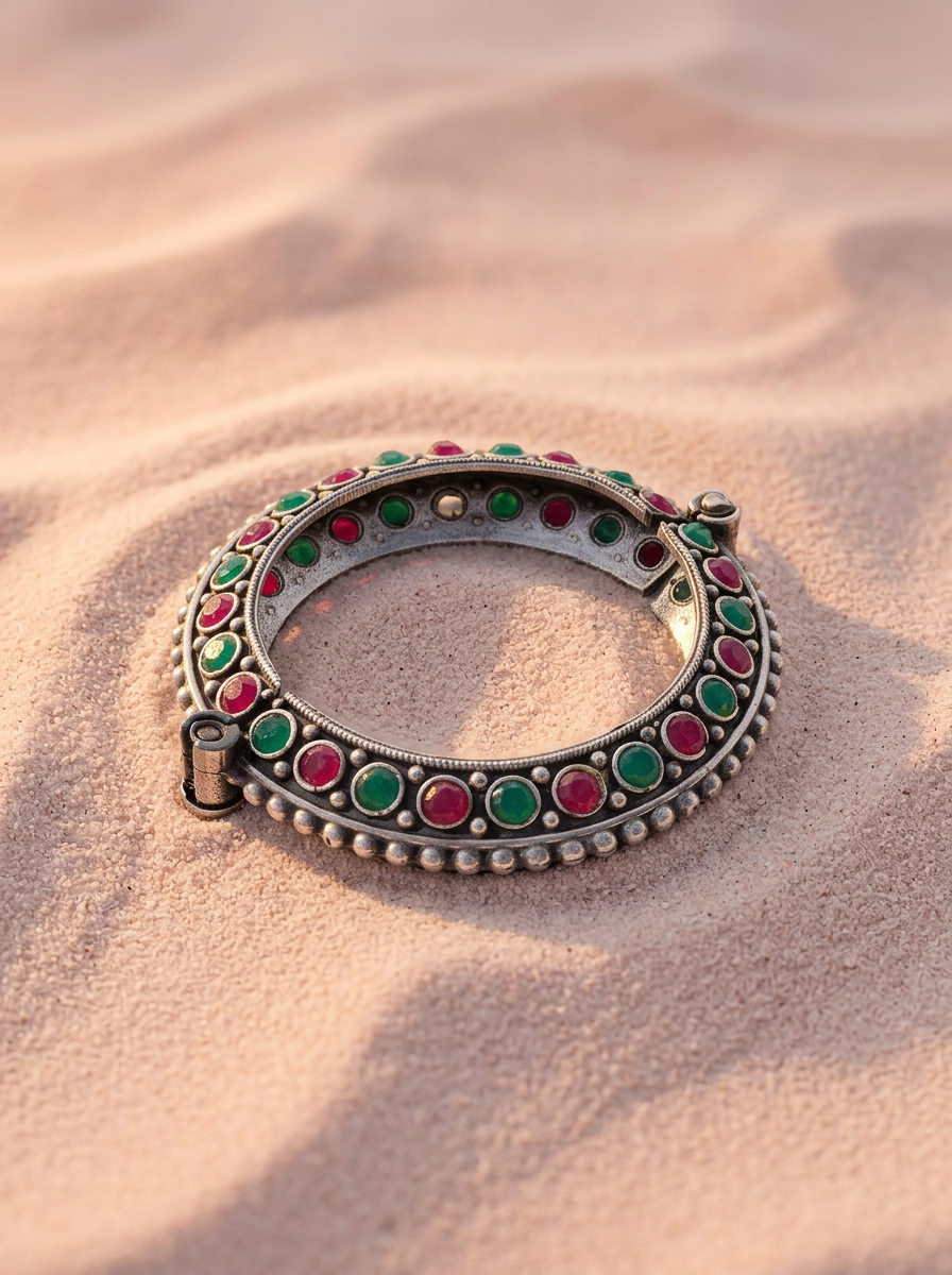 ?Make a bold statement with The Afghan Bangle, a heritage-inspired piece that captures the essence of nomadic artistry. Crafted with a premium oxidized antique finish, this bangle features a striking double-row of alternating emerald-green and ruby-red stones, framed by intricate tribal beadwork.