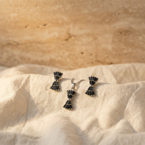Add a touch of playful sophistication to your ensemble with The Midnight Bow set. This coordinated pendant and earring collection features sleek, jet-black baguette crystals meticulously arranged into elegant bow motifs. Set in a polished silver-toned finish, this set offers a perfect blend of feminine charm and modern edge.
