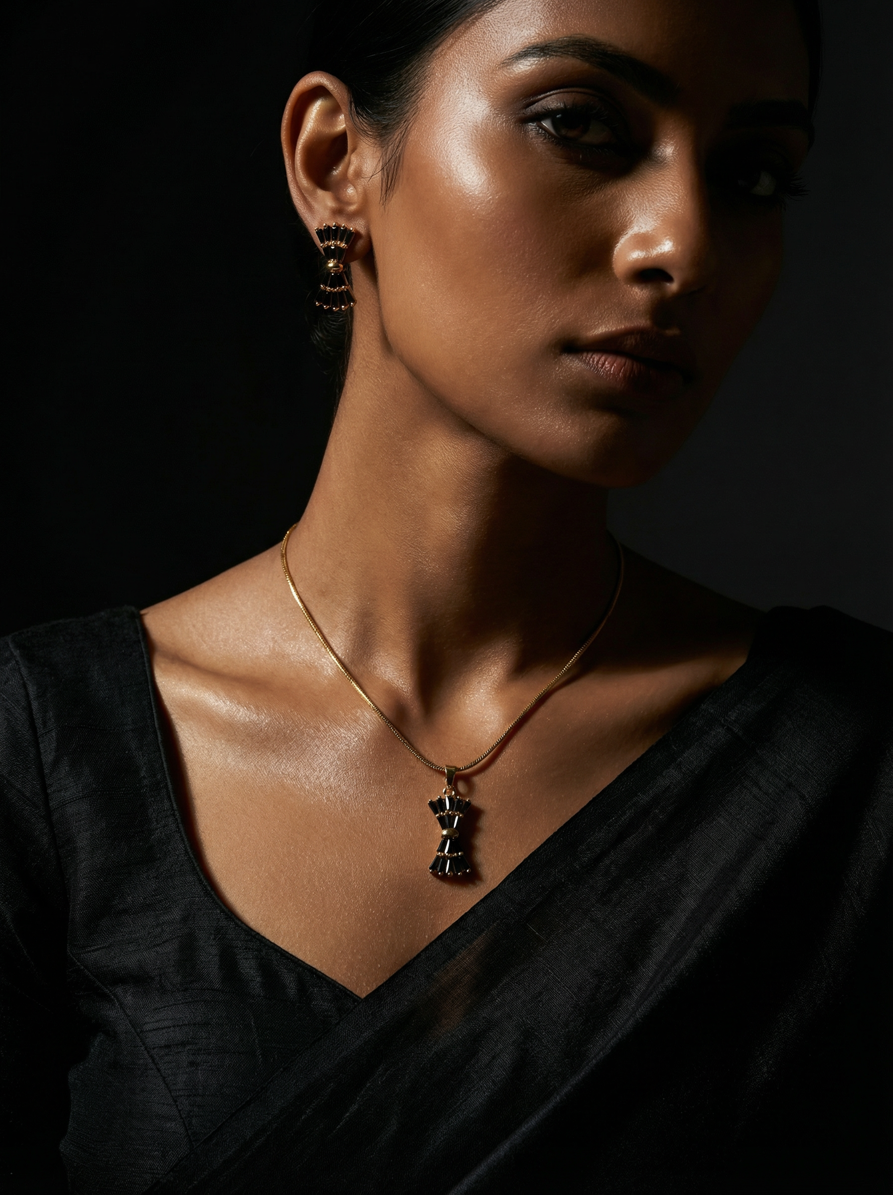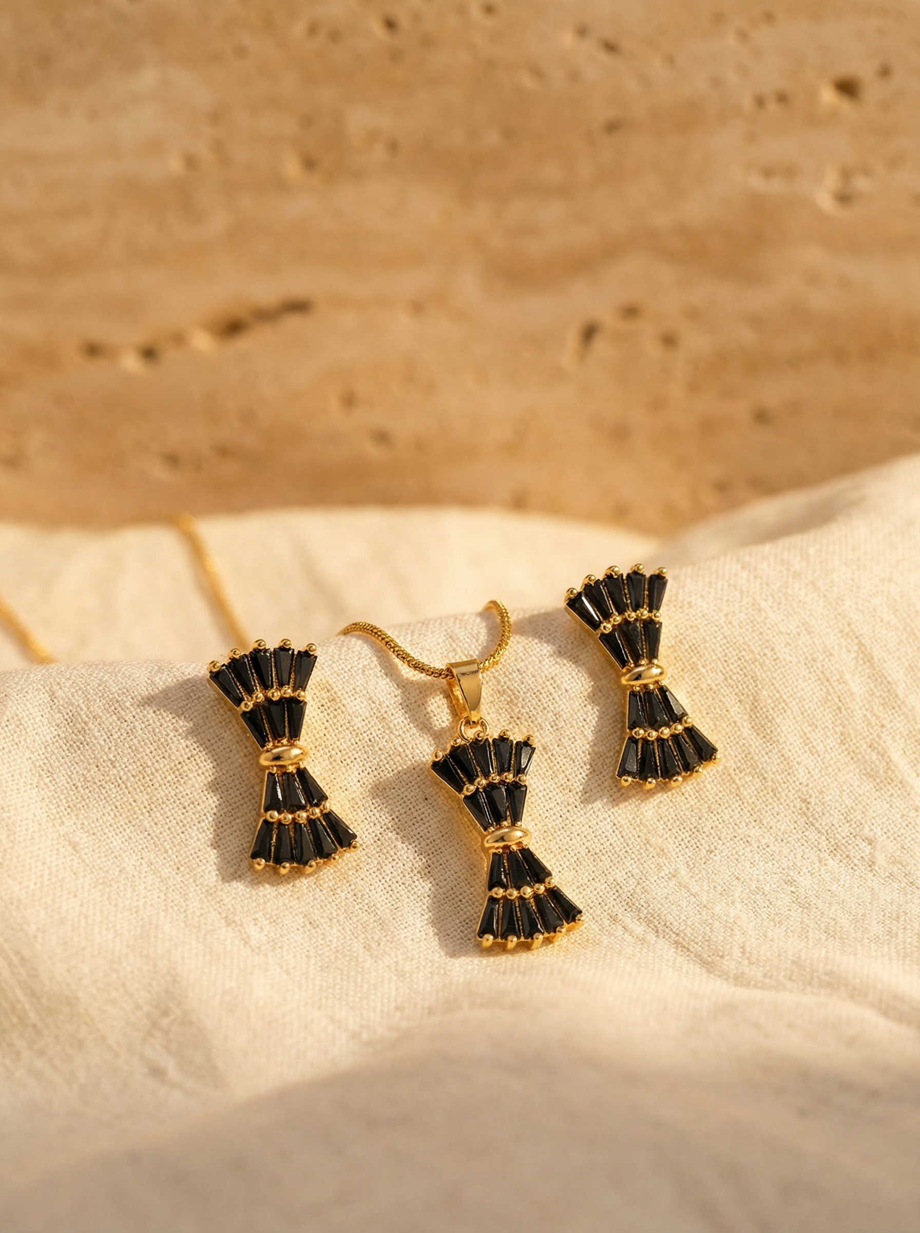 Infuse your look with classic charm and high-contrast luxury. The Golden Bow set features deep, jet-black baguette crystals arranged in a refined bow silhouette, framed by a radiant gold-toned finish. This matching pendant and earring duo strikes the perfect balance between playful femininity and bold, modern elegance.