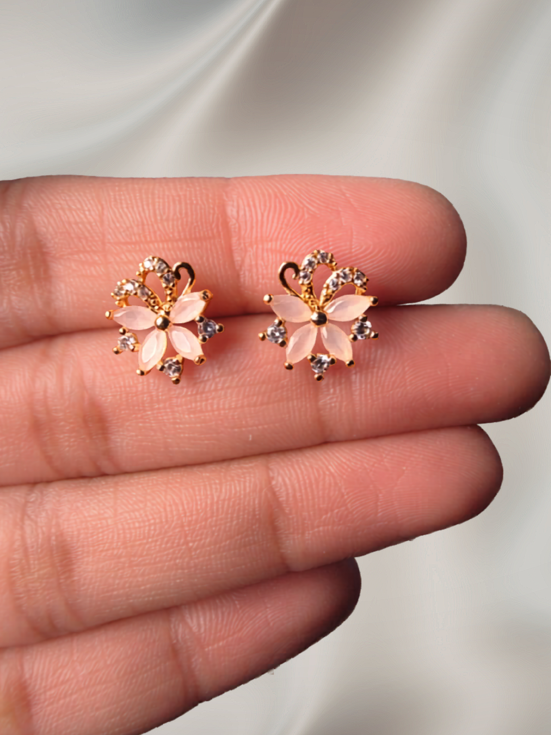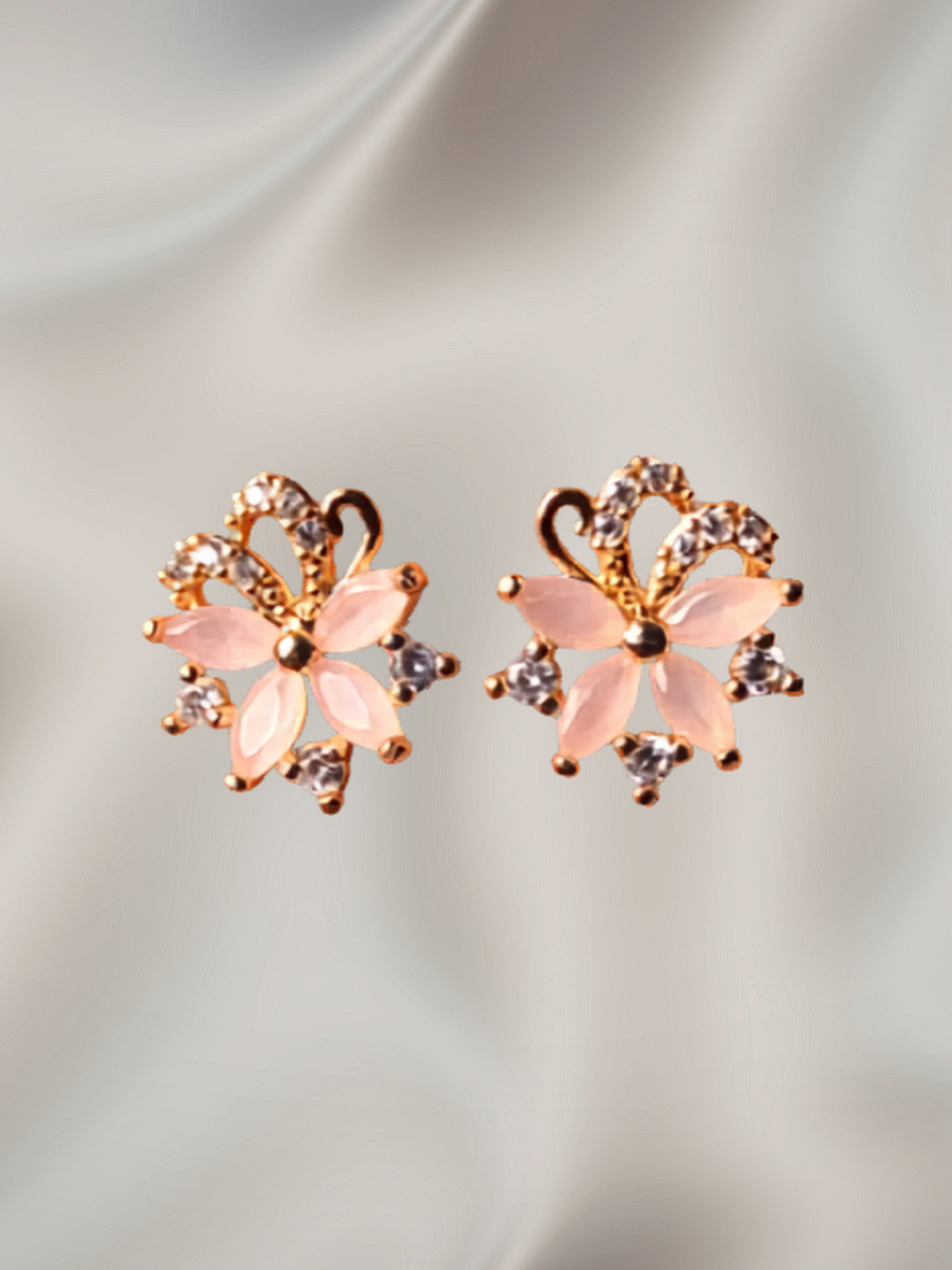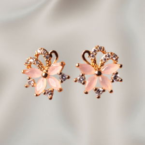 Embrace feminine elegance with these charming pale pink floral gold studs. Designed for daily luxury, these delicate earrings feature pastel pink marquise-cut stone “petals” forming a blooming flower pattern, accented by tiny sparkling clear crystals. A sophisticated filigree top detail finishes the design. Perfect for office wear, casual outings, or gifting, these lightweight studs add a subtle pop of color and sparkle.