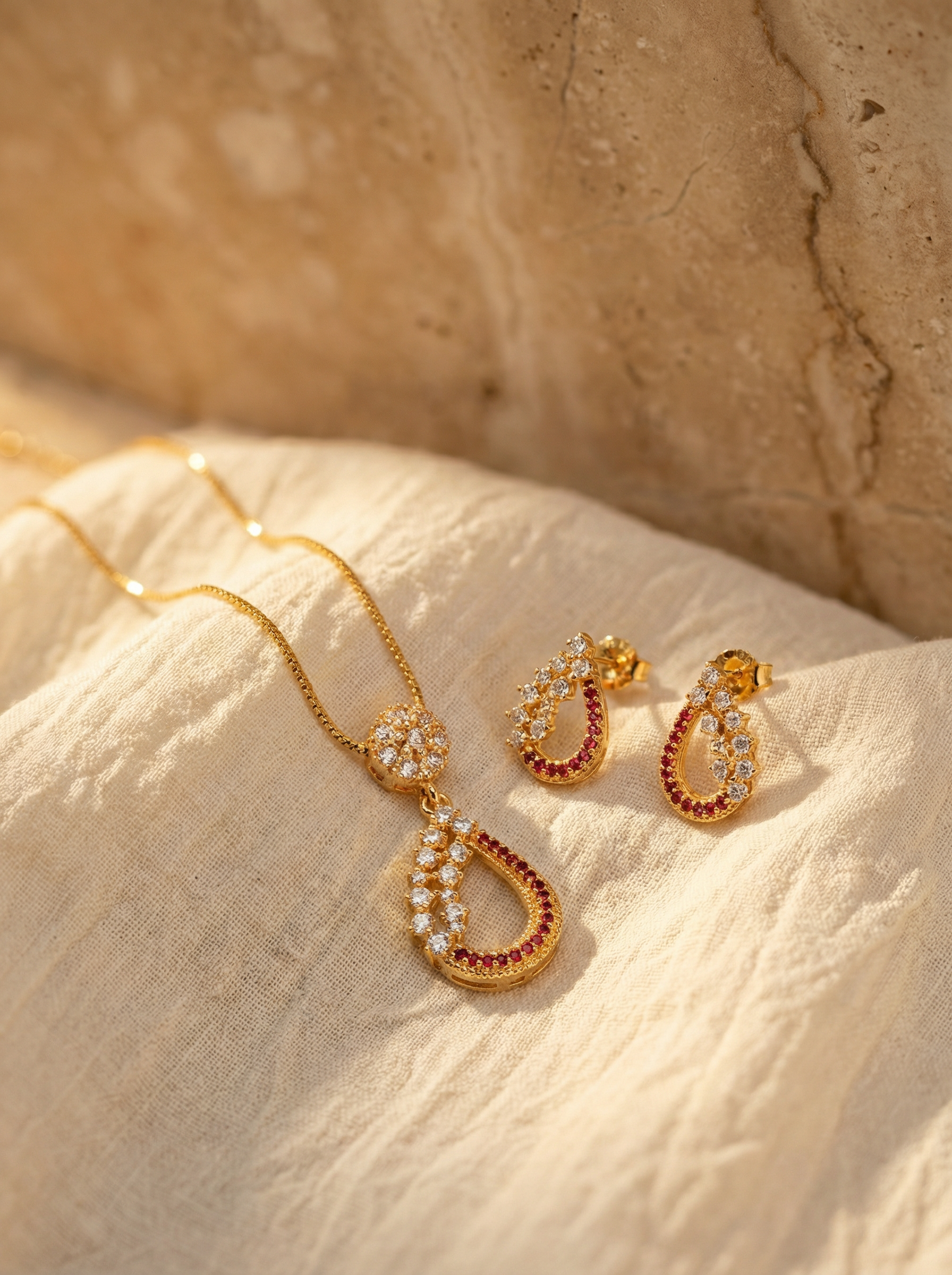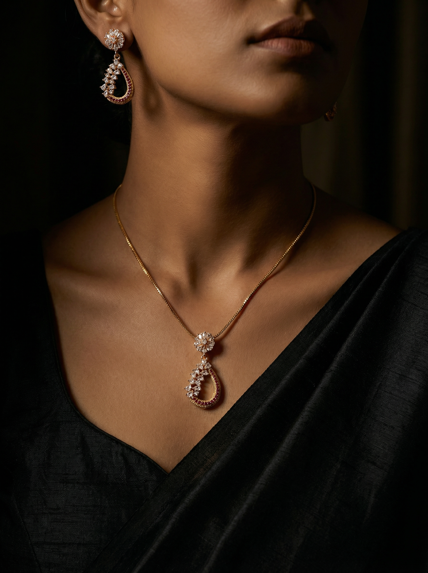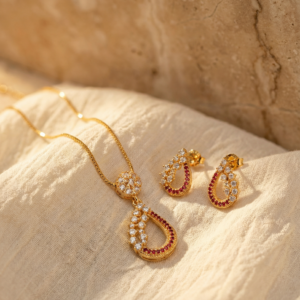 Add a touch of royal brilliance with The Just a Drop set in a stunning crimson and gold palette. This set features a floral-inspired stud that flows into a graceful teardrop pendant, intricately lined with fiery ruby-red crystals and shimmering clear cubic zircons. The warm gold-toned finish enhances the rich red hues, making it an ideal choice for bridal wear, festive celebrations, or formal evening events.