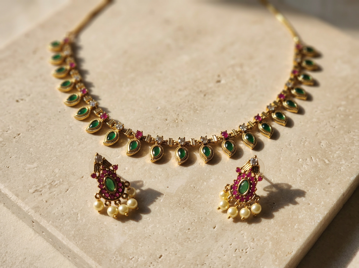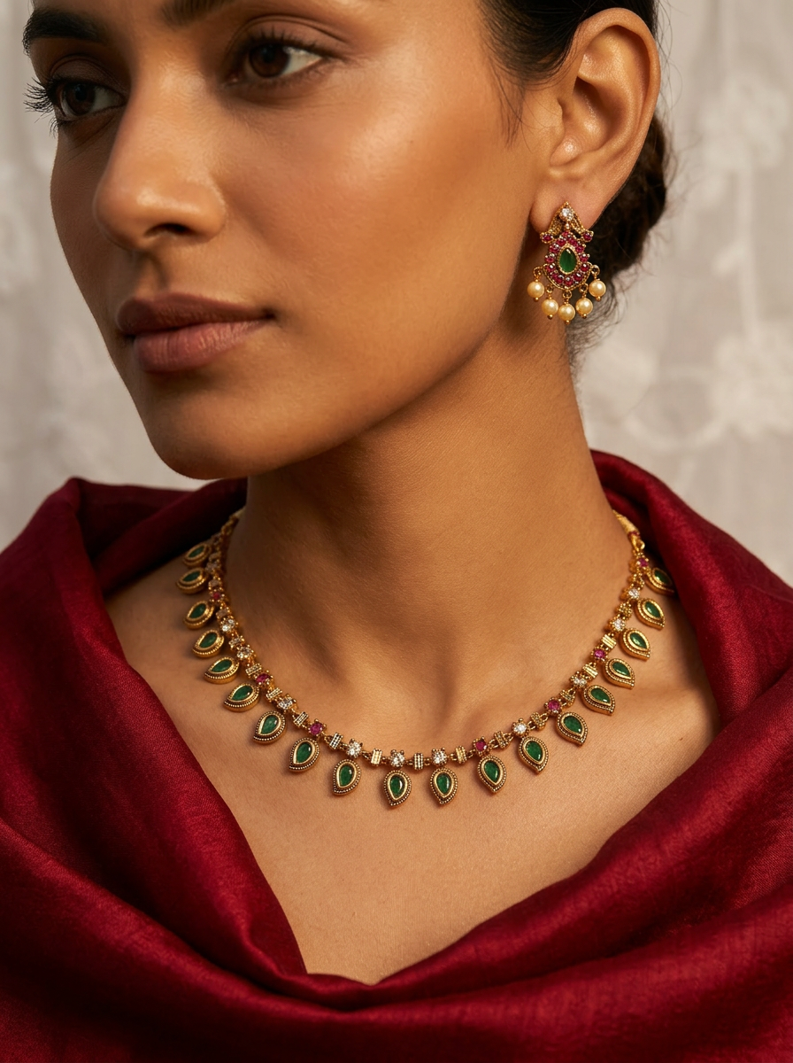 ?Elevate your jewelry collection with the Pretty Paisley Set. This exquisite ensemble features a gold-plated necklace adorned with vibrant, pear-cut faux emeralds and ruby-red accents, perfectly complemented by ornate drop earrings. Inspired by classic paisley motifs, this set blends royal elegance with handcrafted detail, making it an essential statement piece for weddings and festive celebrations.