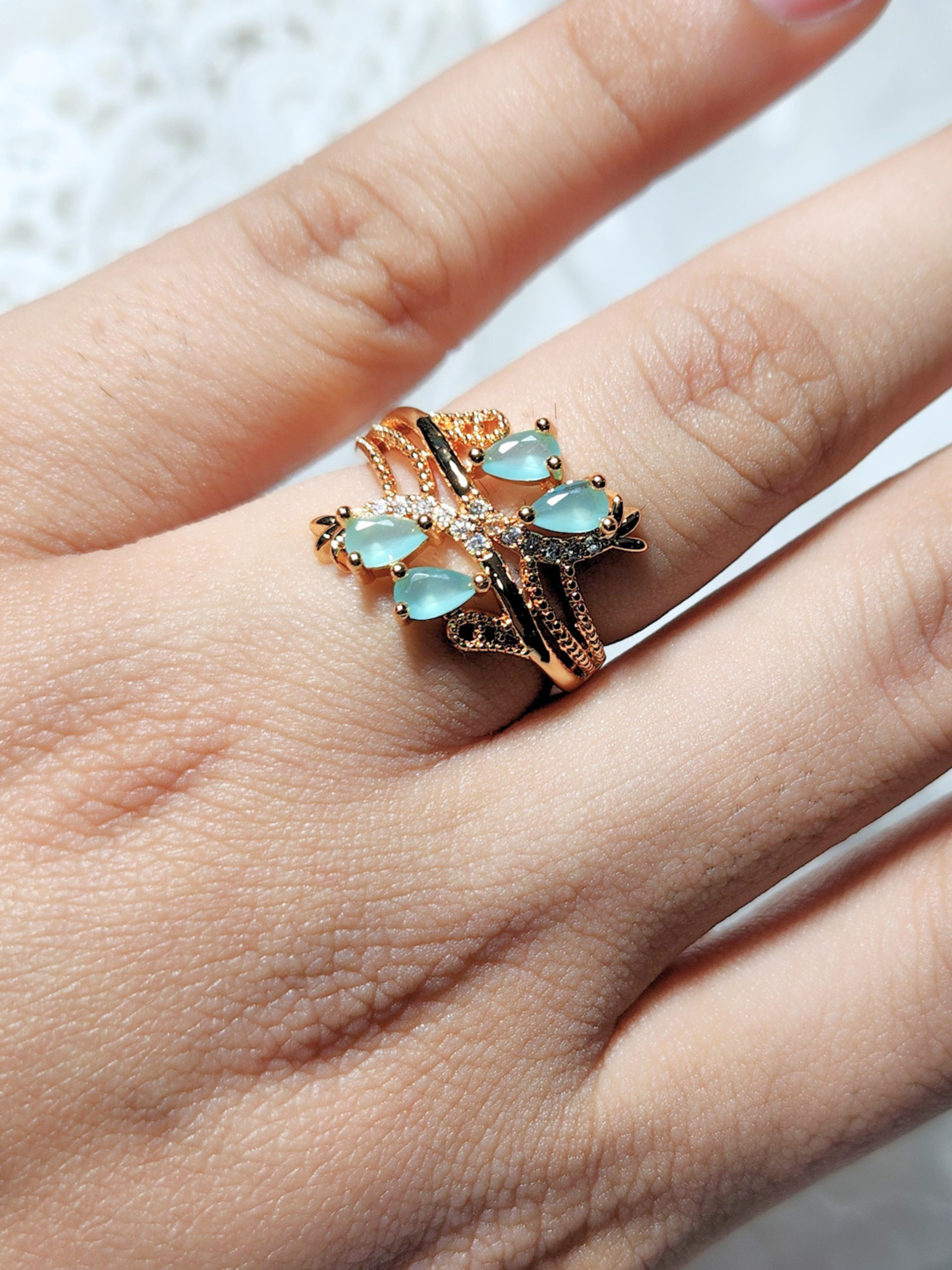 Add a refreshing pop of color to your collection with The Quad, a beautifully intricate ring featuring four serene mint green teardrop stones. The interwoven gold-toned bands, accented with sparkling pavé details, offer a soft yet regal aesthetic that feels like a modern spring heirloom.