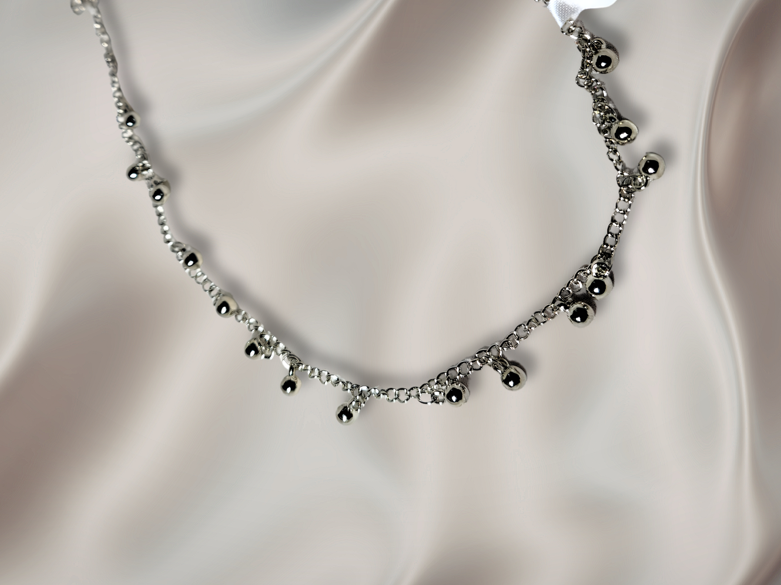 Elevate your jewelry collection with The Silver Orb. This sleek anklet features a series of high-shine, spherical silver-toned beads evenly spaced along a dainty chain. Its minimalist, polished design offers a cool, contemporary shimmer that complements any look, from casual streetwear to elegant evening attire.