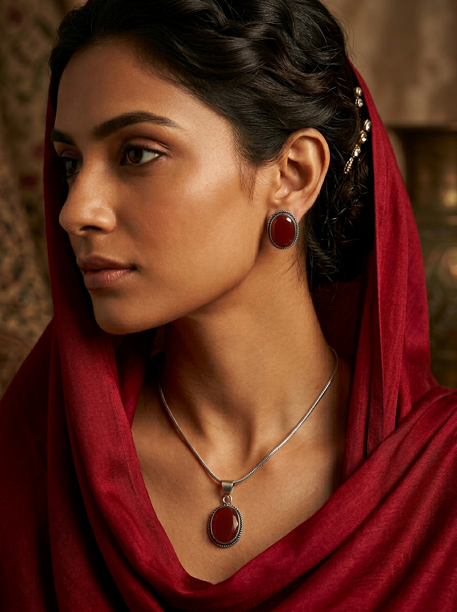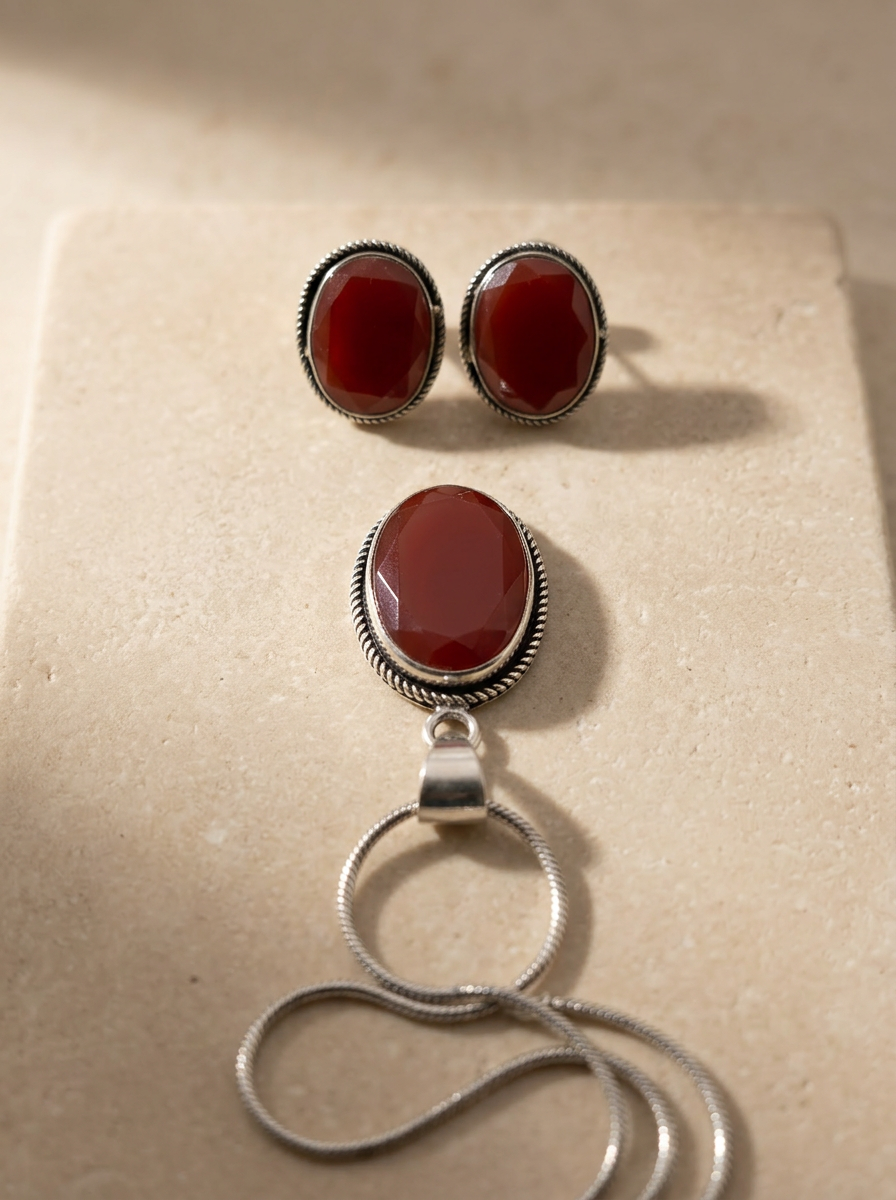 ?Refine your everyday style with The Oval, a sophisticated jewelry set featuring a faceted oval gemstone pendant and matching stud earrings. Defined by its oxidized antique silver finish, each piece features a vintage-inspired rope-textured border that adds depth and character. This set offers a perfect balance of bohemian charm and modern minimalism, available in three striking colors: Crimson Red, Emerald Green, and Onyx Black.